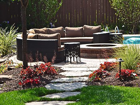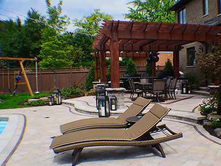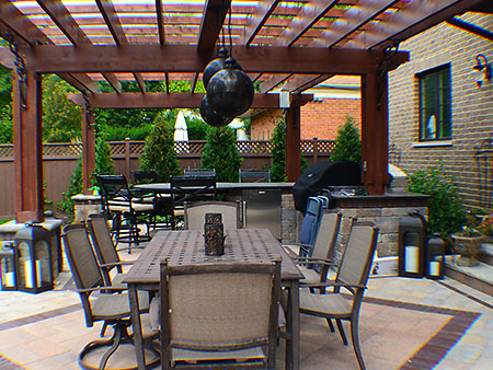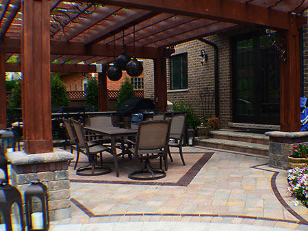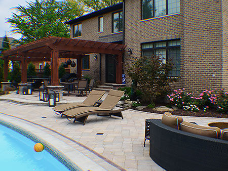 The Elmhurst landscaping project turned out fabulous! The customer added their own unique dining and patio furniture accents along with an outdoor television and speaker units at the pergola, creating a true family outdoor entertainment oasis.