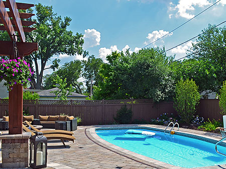 This Elmhurst backyard landscaping transformation included a multi-level patio with pool deck and built-in entertainment island. The island includes a gas barbecue and refrigerator, stepping down to the ‘lower patio – pool deck’ fire pit and plantings.